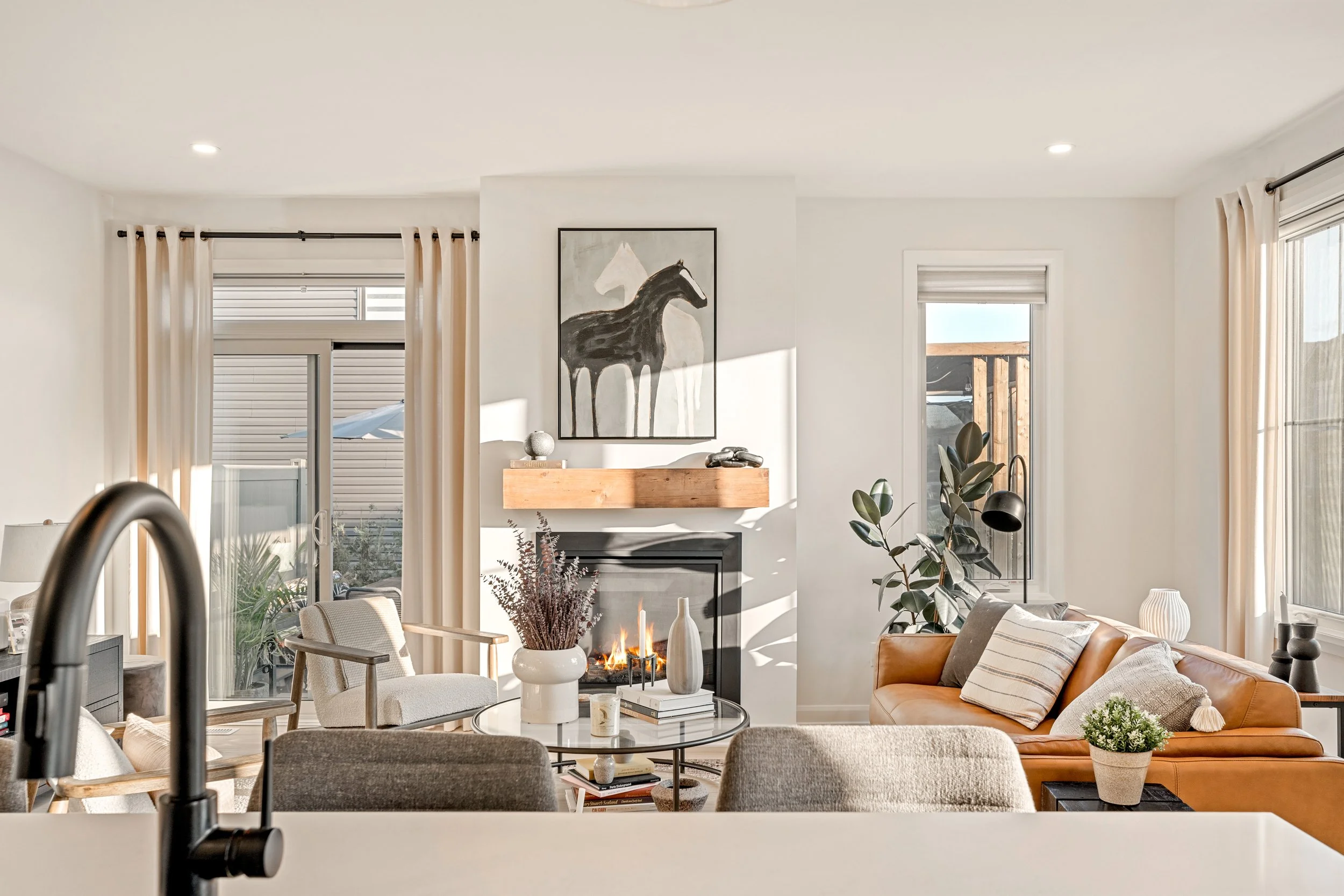 Thoughtfully designed for both comfort and style, the space is anchored by a sleek modern gas fireplace with a rustic wood mantel, perfectly complemented by a pre-wired TV mount above—ideal for cozy evenings or effortless entertaining.