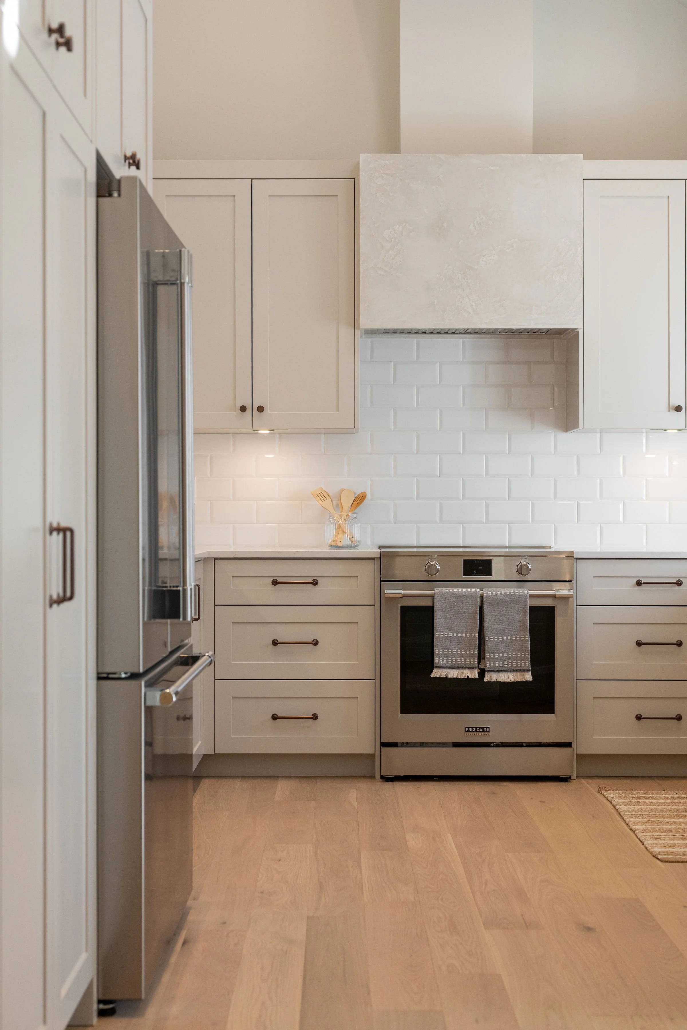 Thoughtfully designed, it showcases high-end appliances, warm custom cabinetry, and a beautifully crafted plastered hood fan that adds a refined, bespoke touch. The sink is perfectly positioned beneath a charming window, while ample storage ensures both function and flow. Striking Hanstone countertops pair seamlessly with a timeless beveled subway tile backsplash, completing the space with understated elegance.