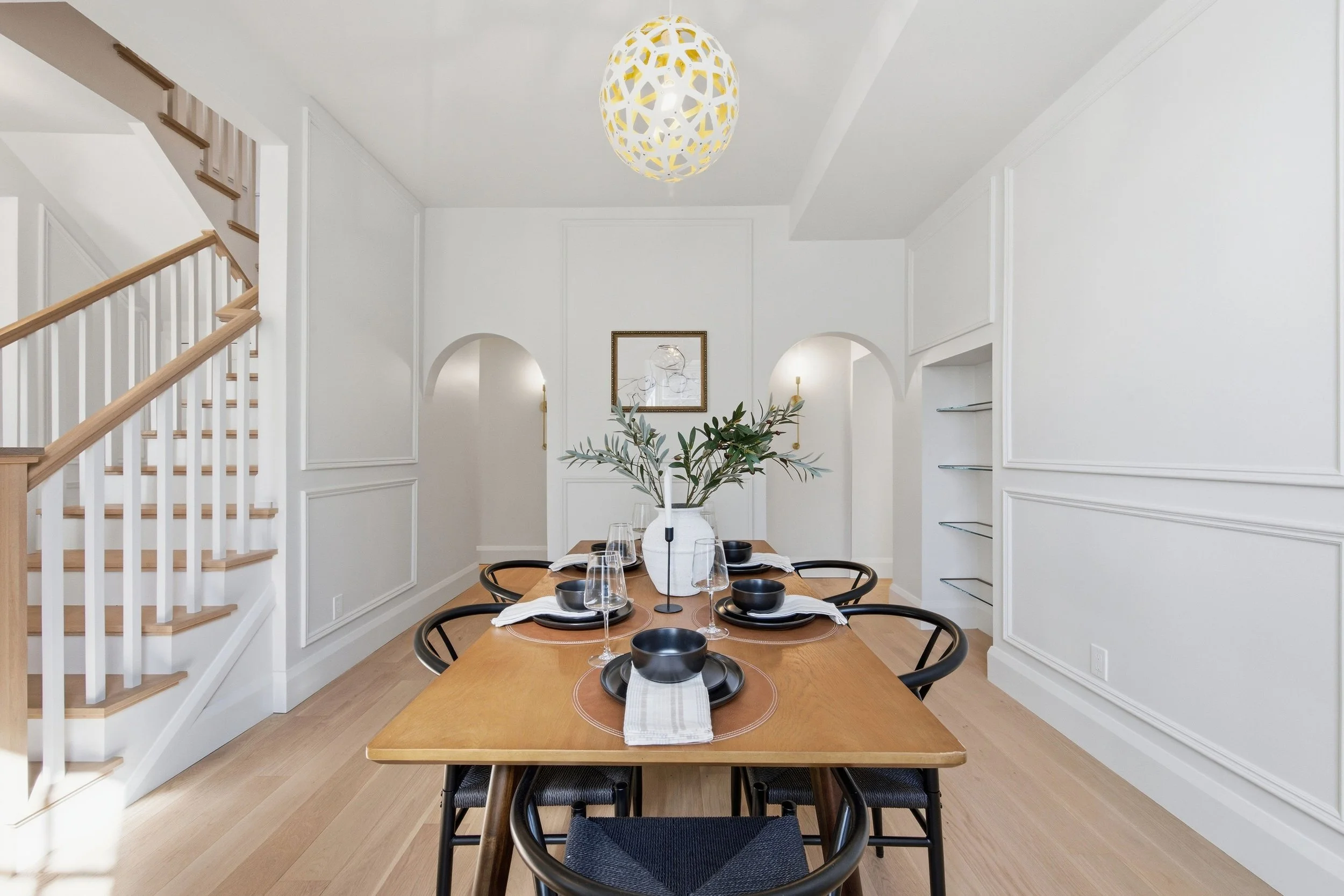 The dining room is a refined and inviting space, beautifully enhanced with custom millwork, elegant wall paneling, and soft architectural arches that add depth and character. A built-in niche with glass shelving creates a striking focal point—perfect for displaying curated pieces.