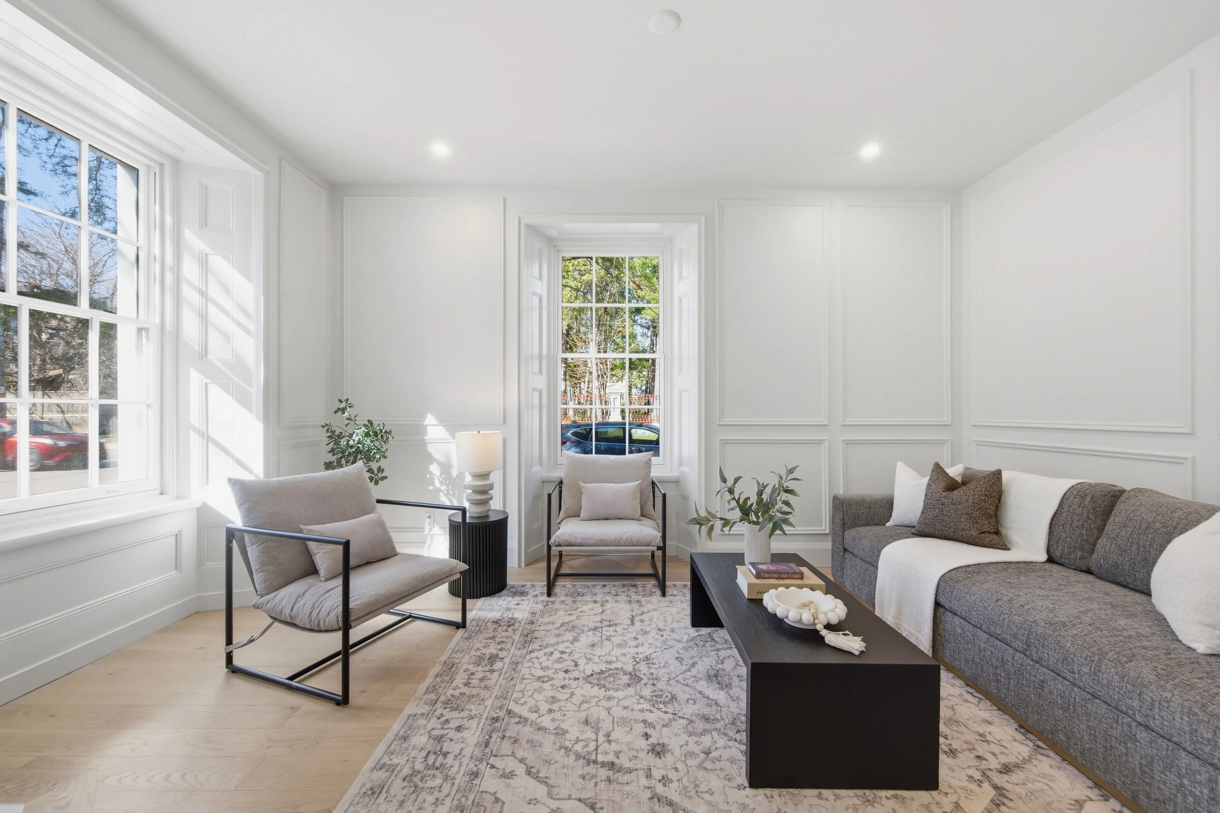 To one side, the living room unfolds as a bright and inviting retreat. Original window framing adds timeless character, while expansive windows bathe the space in natural light and frame peaceful views of the Governor General’s grounds. A beautifully restored fireplace serves as the focal point, blending heritage charm with understated elegance. Surrounded by refined detailing and a soft, cohesive palette, the room offers a perfect balance of comfort and sophistication—ideal for both relaxed living and elevated entertaining.