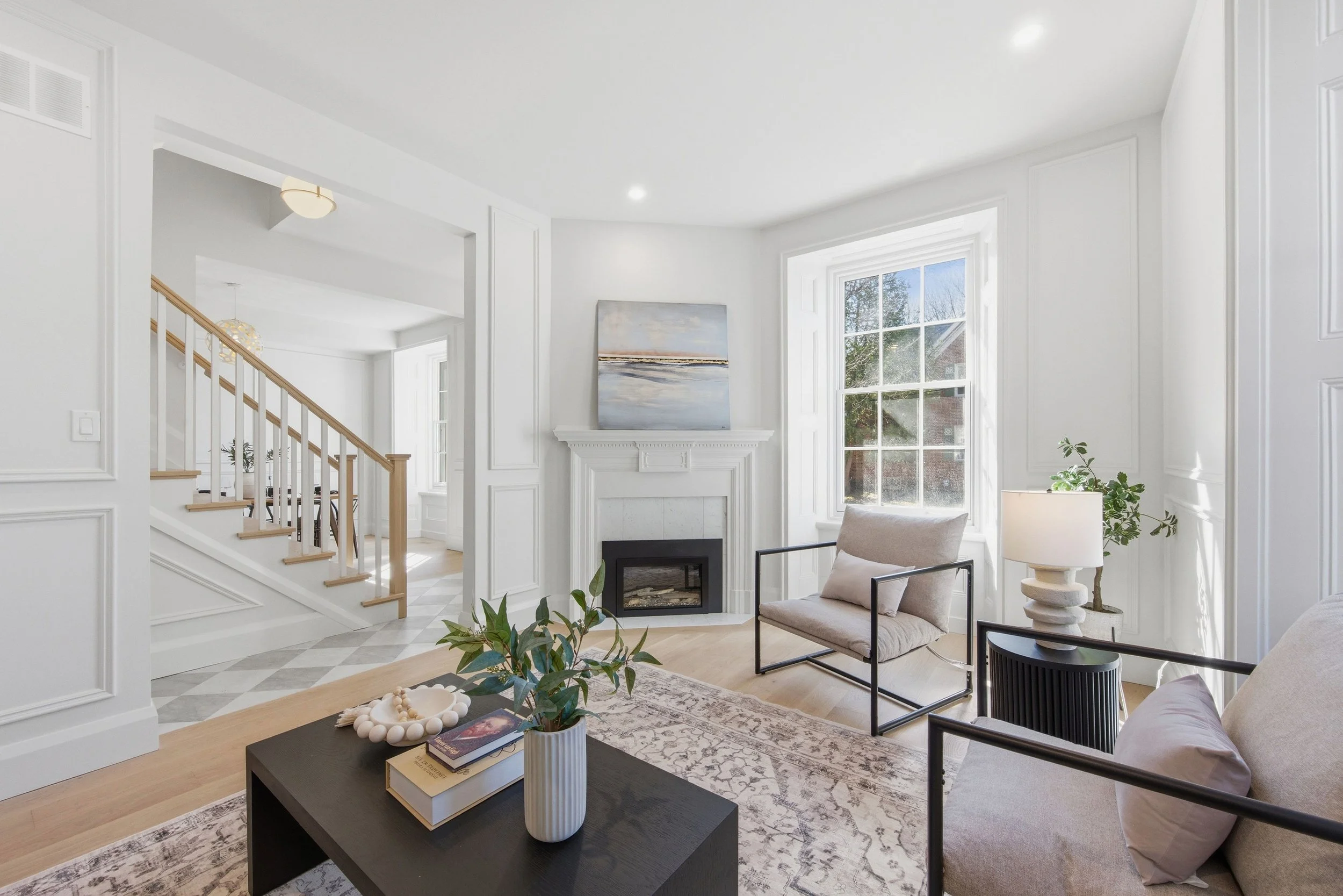 From the moment you enter, the home reveals a refined balance of classic architecture and modern design. The foyer makes an immediate impression with its striking monastery checkered tile, setting a sophisticated tone that flows seamlessly into the warmth of white oak floors beyond. Clean lines, custom millwork, and a thoughtfully centered staircase create a sense of symmetry, gracefully anchoring the living and dining spaces on either side.